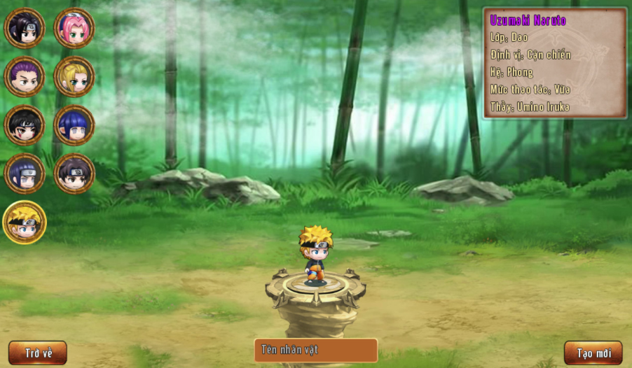 Làng Lá là nơi sinh sống của nhiều ninja tài ba, trong đó có 9 nhân vật chính vô cùng quen thuộc mà bạn có thể nhập vai bất kì vào những người này. Đó là: Naruto, Sasuke, Sakura, Hinata, Ino, Kiba, Shikamaru, Neji và Tenten.